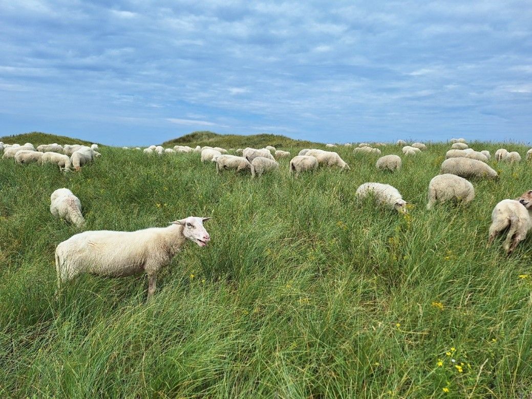 Ook ontmoetten we de schapen die door de herder net in een vers stukje duingras waren gezet en duidelijk hoorbaar hun begrazingstaak daar uitoefenden. Hoe effectief dat is, blijkt een paar honderd meter verder waar de herder de afrastering van het vorige gedeelte opruimt. Daar is vrijwel geen vers gras meer over.