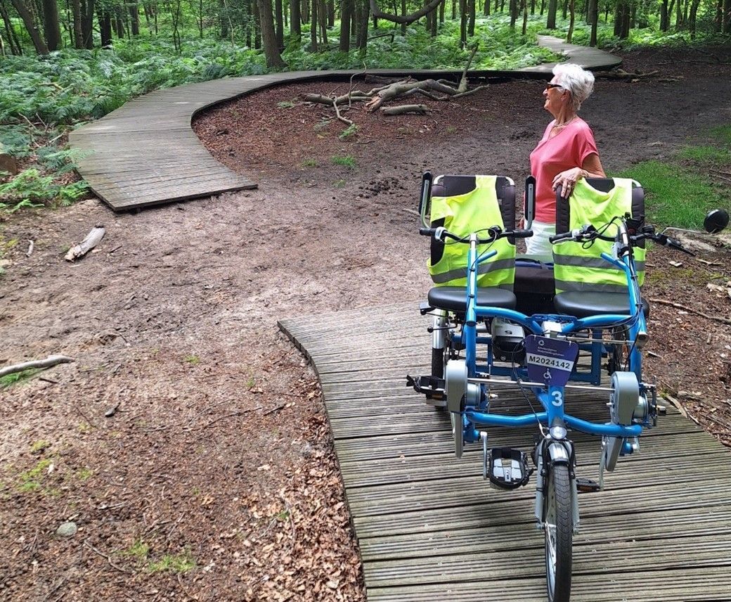 We ontmoetten er een vrijwilliger van de Waterleiding Duinen die daar onderzoek deed naar paddenstoelen. Hij vond het erg leuk dat Fietsmaatjes op de duofietsen zo ook van dit mooie gebied konden genieten. Des gevraagd gaf hij aan dat ook de half-verharde paden ook goed toegankelijk voor onze fiets zijn. Daar hebben we dan ook een paar keer gebruik van gemaakt en zo binnen het – verder geheel afgesloten – infiltratiegebied een extra rondje gemaakt.